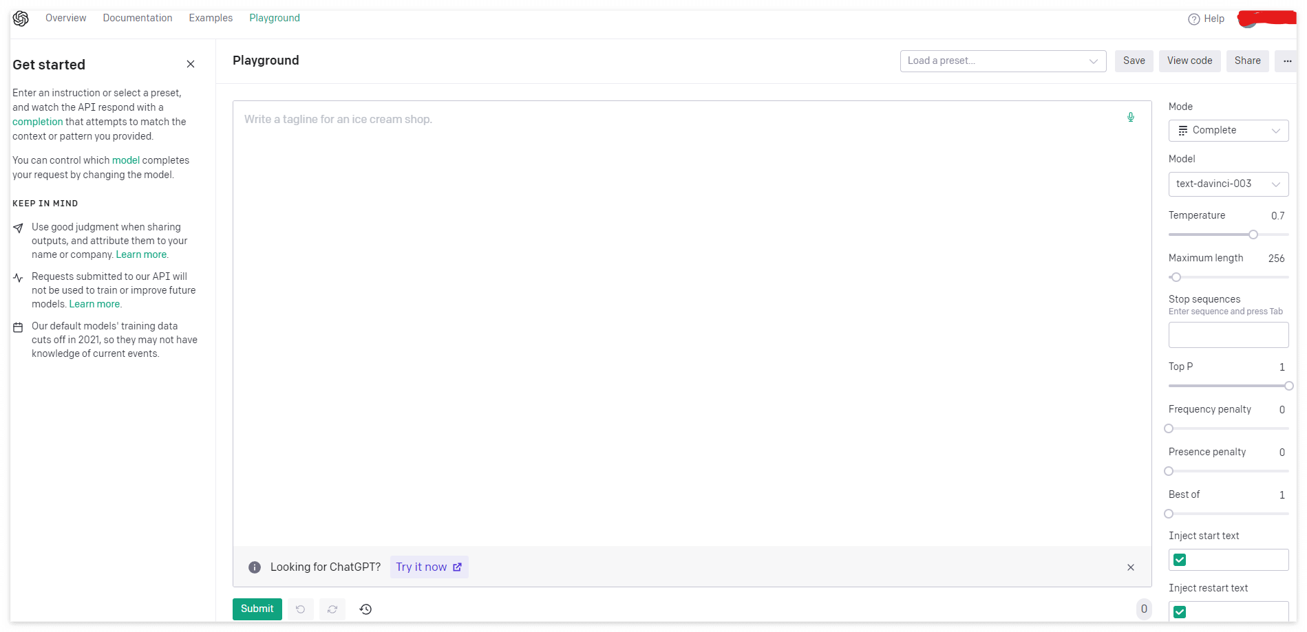 테스트를 해보고 싶다면 Playground 메뉴로 들어가서 테스트해보자. 파라미터값도 변경하고 모델도 쉽게 선택하여 테스트할 수 있다. 자신에게 맞는 모델을 몇번 테스트 후에 선택하는 것이 좋겠다.